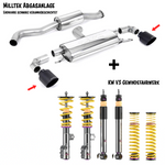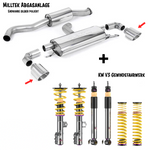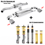 - KW V3 Gewindefahrwerk: Zug- und Druckstufe getrennt einstellbar, VA/HA 25–45 mm Tieferlegung, Edelstahlgehäuse, TÜV-Teilegutachten.